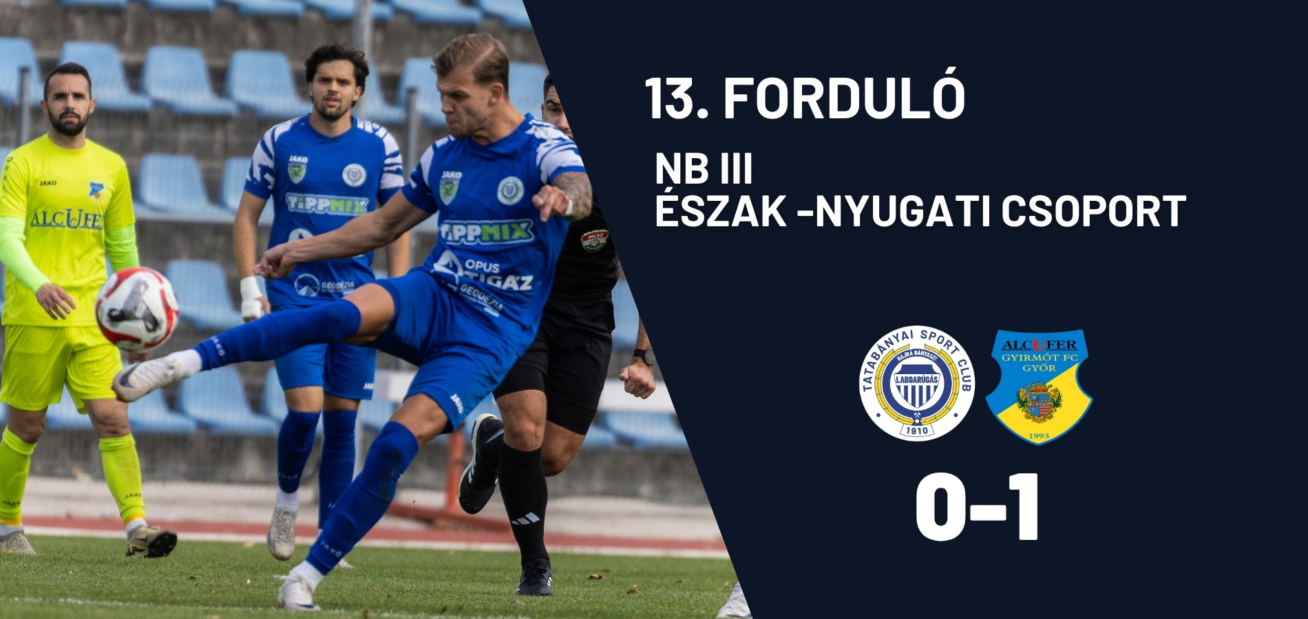 Csapatunk hazai pályán 1-0-s vereséget szenvedett a Gyirmót FC Győrtől az NB III Észak-Nyugati csoportjának 13. fordulójában. A találkozó végig kiegyenlített játékot hozott, számos tatabányai helyzettel, de ezúttal, sajnos nem sikerült a gólszerzés.